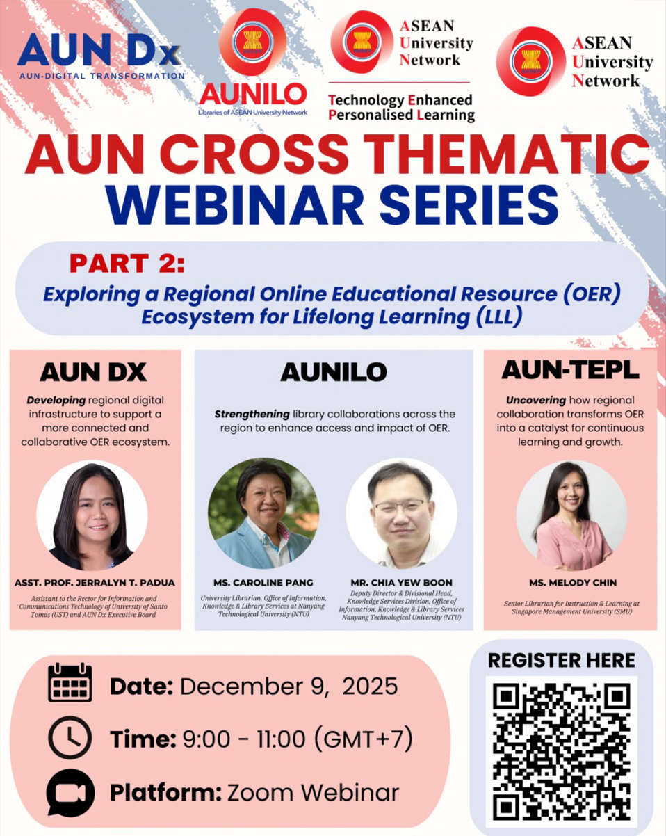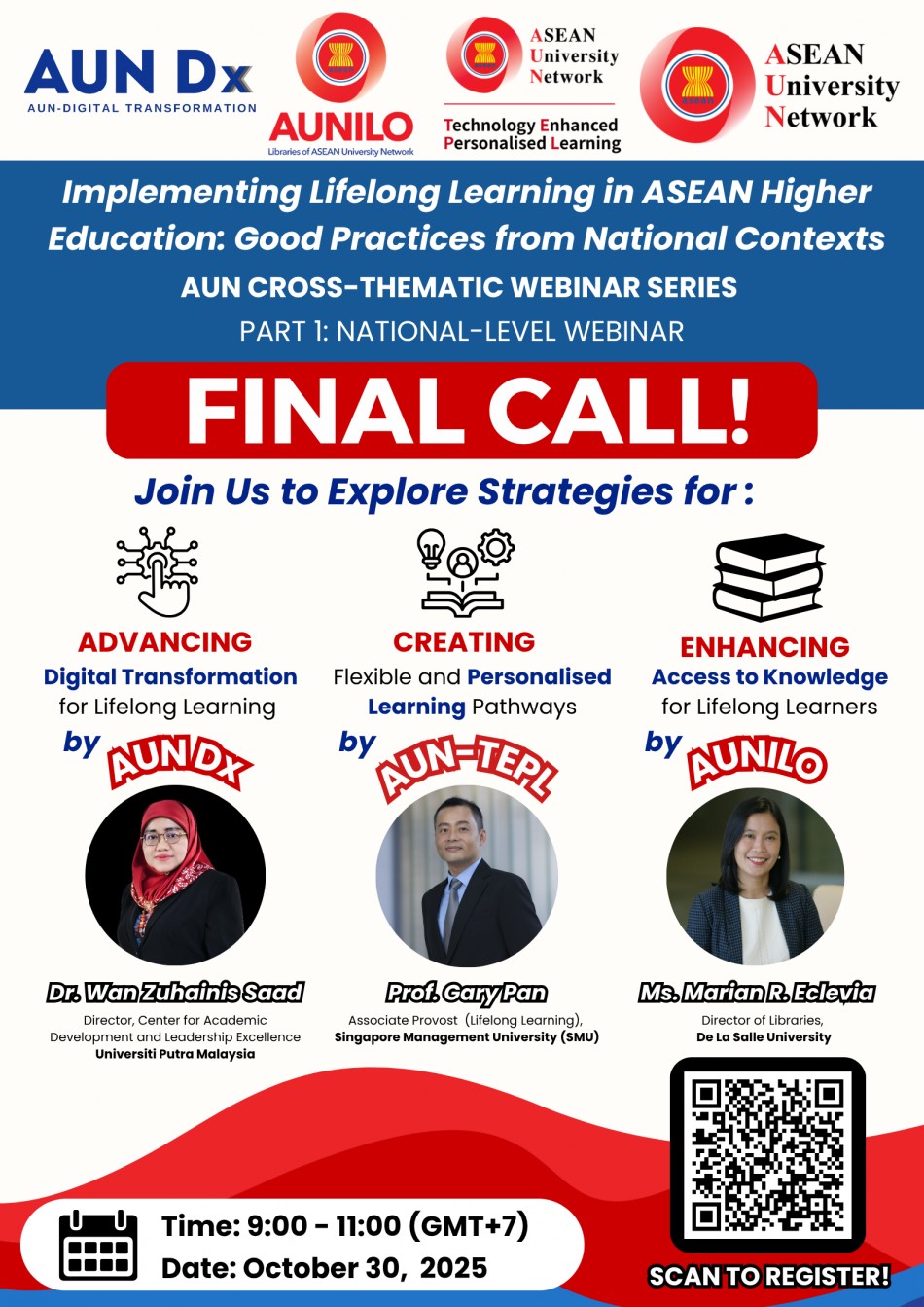 | 30 Oct 2025 | 10am-12pm (SGT) | AUN Cross-Thematic Webinar Part 1 - Implementing Lifelong Learning in ASEAN Higher Education: Good Practices from National Contexts | Event Info |